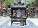 In addition, the 'Cool and Clear Terrace' known as the 'Qingliang Terrace' is behind the main hall, the place where the original sutras were translated.[1][6] This terrace is amidst bamboo forest of old pine trees and has halls which are interconnected. Four sides of the terrace are piled with green bricks. The central building of the terrace is the Vairocana Pavilion, which was originally constructed during the Han dynasty. The present building dates back to the Ming dynasty and was built with a xieshan style roof with double eaves. The pavilion principally enshrines statues of Vairocana Buddha and the Bodhisattvas Manjushri and Samantabhadra. In addition, a total of 5,050 wood-carved Buddha statues, made with incense ash, are enshrined on both sides of the pavilion. The terrace also has the Kunlu Pavilion with halls on its east and west that house the statues of the two eminent monks, She Moteng and Zhu Falan. They were buried inside the temple gate after they died here; the Bell Tower and the Drum Tower, in front of their tombs, were once prominent sights of Luo Yang City.[6]