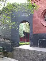 However, this may be a folk etymology as there were other early temples in different centres with the same name. The monk Zhidun (or Chih Tun) (314–366), who was a famous propagator of Buddhism in the southern capital is recorded as having discussions with Fenghui at the Baima si (Pai ma) monastery in Jiankang (previously Jianye), the capital of the Eastern Jin (317-420).[12] There was also a Baima si at Xiangyang where Daoan and his disciples stayed c. 365.[13] To further complicate the search for the origin of the name, there were peoples known as the 'White Horse Qiang' and 'Di' who lived in the 'White Horse Valley' on the upper reaches of the Min River, which flows south from the Min Mountains near the town of Zhangla ([Chang-la]: 32.50° N, 103.40° E) and there are still people calling themselves the 'White Horse Di' living there.[14] It is possible, but unprovable, that the name Baima derived from some of these peoples, who may have been influenced by Buddhism at an early period, rather than from literal white horse(s) carrying scriptures.