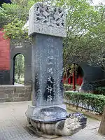 In 1175, an inscription on a stone tablet next to Qilun Pagoda—a 35 metres (115 ft) tall, multi-eaved square-based tower to the southeast of the White Horse Temple—stated that a fire occurred five decades previously and destroyed the temple and the Sakya Tathagata sarira stupa, a predecessor to the pagoda. The same inscription of 1175 stated that a Jin official had the stone Qilun Pagoda erected soon after. The pagoda is built with the design style imitating the square-based pagodas of the Tang Dynasty.[5]