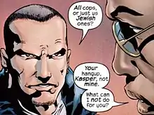 The character was pitched by Priest as a 'dark satire of Spider-Man', in line with work he had done on DC Comics' Steel, who functioned similarly as a 'dysfunctional Superman'.[3] The character of Kasper Cole and his friends and family therefore take many cues from Peter Parker and his supporting cast, with Kasper's mother Ruth correlating with Aunt May, his father Jack with Uncle Ben and his girlfriend Gwen with Gwen Stacy.[3] Priest also drew inspiration from the film Training Day, as well as sitcom Everybody Loves Raymond.[3]