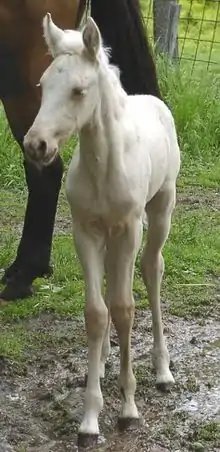 Despite this, some registries still refer to "albino" horses. For example, the Paso Fino Horse Association registers cremellos and other cream colors as "albino."[19] Until 1999, the American Quarter Horse Association (AQHA) described perlino or cremello horses as "albino" in rule 227(j).[20] The AQHA later replaced the word "albino" with "cremello or perlino," and in 2002 the rule was removed entirely. Among Connemara pony breeders, homozygous creams are called "blue-eyed creams" or sometimes "pseudo-albino".[21]
