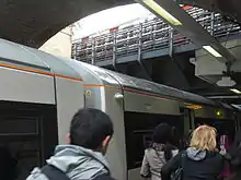 Whitechapel station has bilingual station signage, owing to the large Bengali community in the local area. In March 2022, station signs on the platforms bear "Whitechapel" and also "হোয়াইটচ্যাপেল" in Bengali.[27] It is one of the relatively few stations in England to have bilingual signage, others being Southall (Punjabi), Wallsend (Latin), Hereford (Welsh), Moreton-in-Marsh (Japanese) and St Pancras International, Ebbsfleet International and Ashford International (all French). Mayor of London Sadiq Khan stated that he was "delighted" that the signage was installed ahead of Bangladesh Independence Day on 26 March.[27] The installation was applauded by not only Bangladeshi diplomats, but also Mamata Banerjee, the Chief Minister of West Bengal.[28]