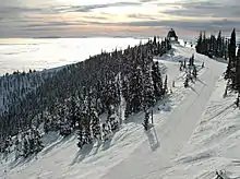 The Great Northern Railway was built through what is now Whitefish in 1904, which sparked the development of the town. The town incorporated in 1905.[7] The area was originally known as Stumptown due to the abundant amount of timber that had to be cleared to build the town and railroad and because tree stumps were left in the streets throughout downtown.[8] Early residents of the town worked for the railroad and nearby logging industries.[9] In 2006, over 68,000 passengers embarked and disembarked through the historic Whitefish Depot, a stop on Amtrak's Empire Builder line,[10] with some percentage of those headed to the ski resort on Big Mountain.