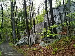 The 'Whitestone Cliffs Trail' is a 1.7-mile (2.7 km) Blue-Blazed hiking trail in the Waterbury area in Thomaston and Plymouth, Litchfield County, Connecticut. It is contained almost entirely in a section of the Mattatuck State Forest. The mainline (official "Blue" "non-dot") trail is a loop trail with one connector trail (Blue-Blazed with yellow dot) to the Jericho Blue-Blazed Trail.