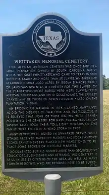 Whittaker Memorial Cemetery is a cemetery near Kildare, Texas. It was added to the Texas Historical Commission in 1996. The cemetery was once portion of a plantation worked by slaves and those buried are African American. The plantation was owned by Willis Whitaker who separated six acres for slave burials. There are more than 350 people buried at the site and it is still used today.[1]