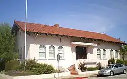For many years, the sole means of transport from this area to Los Angeles was on foot, or via horse and wagon over rough dirt roads, impeding settlement, development, and the export of agriculture.[10] Thus in 1887 "enterprising and aggressive businessmen" contracted with the Southern Pacific Railroad to build the first railroad spur to Whittier, including a depot.[11] The businessmen covered the $43,000 construction cost for the six-mile spur, which branched off from the Southern Pacific mainline at a junction near what is now Studebaker Road between Firestone Boulevard and Imperial Highway.[12] By 1906, 650 carloads of oranges and 250 carloads of lemons were shipped annually by rail. In 1904, the Pacific Electric opened the trolley line known as "Big Red Cars" from Los Angeles to Whittier. In the first two decades, over a million passengers a year rode to and from Los Angeles on the Whittier Line.[6] After World War II, Whittier grew rapidly and the sub-dividing of orange groves began, driven by housing shortages in southern California. In 1955, the new Civic Center complex was completed and the City Council met in new chambers for the first time on March 8, 1955. The city continued to grow as the City annexed portions of Whittier Boulevard and East Whittier. The 1961 annexation added over 28,000 people to the population, bringing the total to about 67,000.[6]