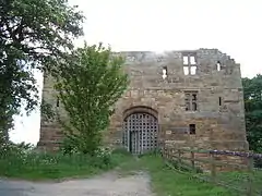 Whorlton Castle was built by Robert de Meynell as a typical 12th century motte and bailey Norman castle. A gatehouse was added in the 14th century. The only remains visible today are the grade I listed gatehouse and traces of the grade II* listed undercrofts (or cellars) of the main building. Due to vandalism access to the site is restricted.[4][5][2]
