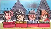 Why can be played by two to four players aged 12 to adult. The four gamepiece characters are each humorous allusions to detectives of popular media fiction: Sergeant Monday (Sergeant Friday), Dick Crazy (Dick Tracy), Charlie Clam (Charlie Chan), and Shylock Bones (Sherlock Holmes). The six "ghosts" in the game are each based on actual historical figures: Daniel Boone, Pocahontas, Napoleon, Nero, Cleopatra and Henry the Eighth. The weapons in the game are a rope, a gun, poison, and an ax. The motive cards include the "Jealousy," "Lover's Quarrel," "Self Defense," and can be used only in conjunction with Alfred Hitchcock "It's A Mystery To Me" card.