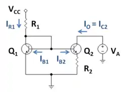 where β2 is the beta-value of the output transistor, which is not the same as that of the input transistor, in part because the currents in the two transistors are very different.[8] The variable IB2 is the base current of the output transistor, VBE refers to base-emitter voltage. This equation implies (using the Shockley diode law):