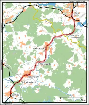 The Wiesau–Cheb railway was a major railway in the German state of Bavaria and the Czech Republic, which was originally part of the main line connecting Regensburg, Weiden and Eger (now Cheb), which was built and operated by the Bavarian Eastern Railway Company (German: Bavarian Ostbahn). In 1945 the line was closed at the border and since 2000 it has been closed completely except for a 3.6 km section.