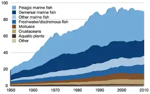 According to the Food and Agriculture Organization (FAO), the world harvest by commercial fisheries in 2010 consisted of 88.6 million tonnes of aquatic animals captured in wild fisheries, plus another 0.9 million tons of aquatic plants (seaweed etc.). This can be contrasted with 59.9 million tonnes produced in fish farms, plus another 19.0 million tons of aquatic plants harvested in aquaculture.[1]