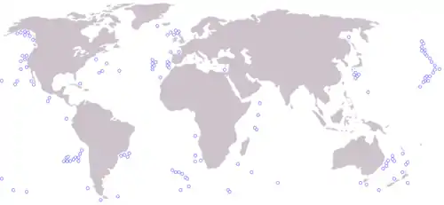 ![]() The locations of the world's major seamounts A seamount is an underwater mountain, rising from the seafloor that does not reach to the water's surface (sea level), and thus is not an island. They are defined by oceanographers as independent features that rise to at least 1,000 meters above the seafloor. Seamounts are common in the Pacific Ocean. Recent studies suggest there may be 30,000 seamounts in the Pacific, about 1,000 in the Atlantic Ocean and an unknown number in the Indian Ocean.[38] |