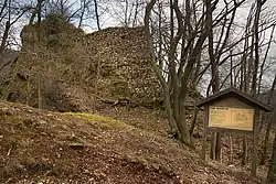 Wildenstein Castle (German: Burg Wildenstein) is a ruined hill castle on a hill, 486 m above sea level (NN), in the Wildenstein valley (Wildensteiner Tal), hidden in a wood at the foot of the Donnersberg near Dannenfels in the county of Donnersbergkreis in the German state of Rhineland-Palatinate.