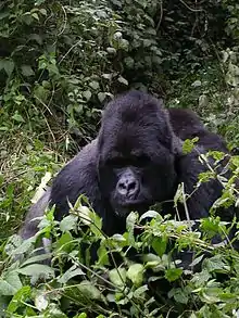 Nearly half of the mountain gorillas in the world live in the Bwindi Impenetrable National Park, and it is also a sanctuary for colobus monkeys and chimpanzees, and birds such as hornbills and turacos.[12] In the Queen Elizabeth National Park there are 95 species of mammal, including African buffalo, Ugandan kob, hippopotamus, Nile crocodile, African bush elephant, African leopard, lion, and chimpanzee. The area around Ishasha in Rukungiri District is famous for its tree-climbing lions, whose males sport black manes.[13]