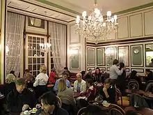 The Konditorei was founded in 1891 by Wilhelm Josef Sluka and his wife Josefine.[2] On the basis of his high-quality products Sluka received in 1896 the title of "confectioner to the k.u.k. court" ("k.u.k. Hofzuckerbäcker"). The café was patronised by customers of the highest social strata, including the Empress Elisabeth. Its central location and discrete atmosphere attracted ministers and representatives from the nearby Parliament Building on the Ringstrasse, gentlemen from the Rathaus, stars of the Burgtheater and members of the nobility and bourgeoisie.
