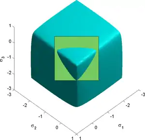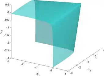 ![]() View of Ulm-Coussy-Bazant version of the three-parameter Willam-Warnke yield surface in 3D space of principal stresses for |