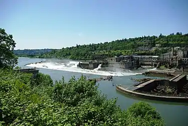 The Willamette Falls is a natural waterfall on the Willamette River between Oregon City and West Linn, Oregon, in the United States. It is the largest waterfall in the Northwestern United States by volume, and the seventeenth widest in the world.[1] Horseshoe in shape, it is 1,500 feet (460 m) wide and 40 feet (12 m) high with a flow of 30,849 cu ft/s (874 m³/s), located 26 miles (42 km) upriver from the Willamette's mouth.