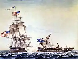 In 1800 during the months before the First Barbary War broke out, Bainbridge was given the ignominious task of carrying the tribute which the United States still paid to the Dey of Algiers to secure exemption from capture for U.S. merchant ships in the Mediterranean.[14] Upon arrival in the 24-gun USS George Washington, he allowed the harbor pilot to guide him directly under the guns of the fort overlooking the harbor. Upon his arrival the Dey demanded that Bainbridge use his ship to ferry the Algerian ambassador and tributary gifts to Constantinople, and that he fly the Algerian flag during the journey. With George Washington under the guns of the fort and surrounded by the Dey's warships and military personnel Bainbridge reluctantly complied for fear of imprisonment, raised the Algerian flag on his masthead and delivered gifts of animals and slaves to Constantinople.[15][16]