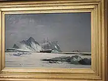 With funds provided by LeGrand Lockwood, Bradford traveled to Greenland in 1869, his farthest northern excursion, reaching eventually as far as 75° north latitude aboard the steamship Panther, accompanied by photographers John L. Dunmore and George Critcherson.[5] Upon his return, Bradford spent two years in London, where he published an account of his trips to the north, entitled The Arctic regions, illustrated with photographs taken on an art expedition to Greenland; with descriptive narrative by the artist.(London, 1873)[1][6][7][2] In 1874, he was elected into the National Academy of Design as an Associate member.[8]