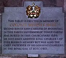 Colonel William Careless is recorded as living in Hallow, Worcestershire in the 1680s; he died in London, and was buried in his native Brewood, 28 May 1689.[14] A memorial to William Careless is to be found in the church of St Mary the Virgin and St Chad, Brewood; he is believed to be buried in the churchyard though his original monument no longer exists; a replacement headstone was erected in Victorian times.