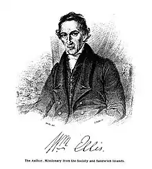 William Ellis (29 August 1794 – 9 June 1872) was a British missionary and author. He travelled through the Society Islands, Hawaiian Islands, and Madagascar, and wrote several books describing his experiences.