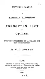 William George Horner (9 June 1786 – 22 September 1837) was a British mathematician. Proficient in classics; mathematics, he was a schoolmaster, headmaster and schoolkeeper, who wrote extensively on functional equations, number theory and approximation theory, but also on optics. His contribution to approximation theory is honoured in the designation Horner's method, in particular respect of a paper in Philosophical Transactions of the Royal Society of London for 1819. The modern invention of the zoetrope, under the name Daedaleum in 1834, has been attributed to him.[1][2][3]