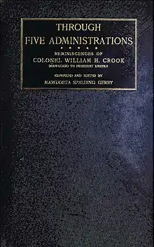 Crook set his memoirs down on paper in the book Through Five Administrations: Reminiscences of Colonel William H. Crook, Body-Guard to President Lincoln, compiled and edited by Margarita Spalding Gerry. There are six administrations covered, however, from Lincoln to Chester A. Arthur, although James A. Garfield and Arthur are dealt with in a single chapter.