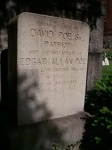 Henry was raised by his grandparents, Elizabeth Cairnes Poe and David Poe, Sr.[10] David Poe, Sr. had been a quartermaster in the American Revolutionary War and paid for supplies out of his own pocket, including $500 for clothing for the troops. His commitment had earned the respect and friendship of the Marquis de LaFayette[11] and the honorary title of "General".[12] David Poe, Sr. died in 1816,[13] and his wife, Elizabeth Cairnes Poe, though sickly and bedridden,[14] outlived her grandson and died on July 7, 1835.[15]