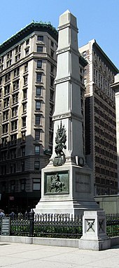 Worth's remains were reinterred in a 51-foot granite monument on Worth Square on a traffic island between Fifth Avenue and Broadway at 25th Street in New York City's borough of Manhattan. The Worth Monument is the second oldest monument in New York. The monument was designed and built by James G. Batterson in 1857.[5] The monument’s central decorative bands are inscribed with battle sites significant in Worth’s career and attached to its front is a bronze equestrian relief of Worth. Each spike of the cast-iron fence surrounding the memorial is topped with a plumed helmet, reflective of the plumed helmet Worth is shown wearing in the memorial. The American painter Thomas Hart Benton depicted the obelisk in New York, Early Twenties. The north side fence was removed around 1940 to accommodate an above-ground utility shed which services the water supply system pipes beneath the monument.