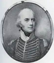 Loftus was appointed as ADC to successive Lords Lieutenant of Ireland from 1778 until 1783. He forged life-time friendships in this office,[14] seen as "a good officer and so respectable in his character and connexxions".[15] Loftus returned to active duty in the 3rd Regiment of Guards purchasing a company in 1784, and served as Lt-Colonel [14] based in London. He moved his family to Norfolk in 1790 (ibid.) and in 1794, raised the 24th Light Dragoons, appointed Brevet Colonel of that regiment[16][17](portrait left). In 1796, Loftus was made a Major General on the English staff[14] and was sworn in as a Member of the Irish Parliament for Lord Ely and returned to Westminster as member for Great Yarmouth for Lord Townshend in the same year.[18] Loftus was removed to the Irish staff in 1797 at the request of Lord Camden[19] and appointed to be Commander in Chief in Munster based in Cork. He reported back to Camden that the Catholics of Munster were in favour of "good order and government" and that if he wanted to root out sedition, he should look at "Dublin or the North".[20] Loftus left the grateful citizens of Cork in 1798 to take command of Laughlinstown camp.[21][22] In the same year, he commanded a brigade at the battle of Vinegar Hill[23] and presided over a military court at the trial of Wolfe Tone.[24]