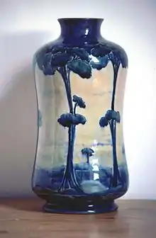 He then developed his famous Florian Ware, with heavy slip and a translucent glaze which produces brilliance of colour.[3] Florian Ware was influenced by art nouveau. It was decorated entirely by hand, with the design outlined in trailed slip using a technique known as tubelining. Florian Ware was a great success and won him a gold medal at the World's fair, the St. Louis International Exhibition in 1904. Unusually at that time, he adopted the practice of signing his name, or his initials, on nearly all the pottery he designed, the production of which he personally oversaw. In due course the extent to which his success had overshadowed Macintyre's other manufacturing activities resulted in resentment on the part of his employers, culminating in their decision in 1912 to close down his studio.