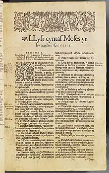 Morgan was still at Cambridge when William Salesbury published his Welsh New Testament in 1567.[7] While he was pleased that this work was available, Morgan firmly believed in the importance of having the Old Testament translated into Welsh as well. He began work on his own translation of the Old Testament in the early 1580s and published this, together with a revision of Salesbury's New Testament, in 1588.[6]