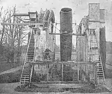 During the 1840s, he had the Leviathan of Parsonstown built, a 72-inch (6 feet/1.83 m) telescope at Birr Castle, Parsonstown, County Offaly. The 72-inch (1.8 m) telescope replaced a 36-inch (910 mm) telescope that he had built previously. He had to invent many of the techniques he used for constructing the Leviathan, both because its size was without precedent and because earlier telescope builders had guarded their secrets or had not published their methods. Details of the metal, casting, grinding and polishing of the 3-ton 'speculum' were presented in 1844 at the Belfast Natural History Society.[7] Rosse's telescope was considered a marvellous technical and architectural achievement, and images of it were circulated widely within the British commonwealth. Building of the Leviathan began in 1842 and it was first used in 1845; regular use waited another two years, due to the Great Irish Famine. It was the world's largest telescope, in terms of aperture size, until the early 20th century. Using this telescope Rosse saw and catalogued a large number of nebulae (including a number that would later be recognised as galaxies).[8][9]