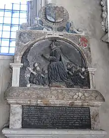 He died on 9 October 1604, in the year of his seventieth birthday, at his house at Little Fulford (renamed Shobroke Park in the early 1800s, demolished)[15] east of Crediton in Devon. His monument exists in Crediton parish church to the north of the chancel, showing a life-like effigy of his recumbent figure his head propped up on his hand. He had served at the Exchequer for eleven years and nine months, and his funeral and burial in Crediton Church appears to have been a significant event, as it was well attended, according to Prince not only by "The gentry, clergy, and others in these parts, but also with heralds at arms, marshalling all according to their rank and place".[3]
