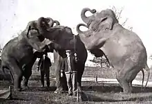 The Colonel: The Colonel, as he was known to friends (Colonel being an honorary title bestowed on auctioneers), filled his farm with dozens of animals of all kinds bought up at discount prices from failing or defunct circuses all over the US. It was said a child in Schuyler County didn't have to run away to join the circus, because the circus had run away to them.[12] Camels, lions, bears, and especially elephants were housed in giant barns and paddocks, while surplus circus wagons and other equipment dotted the landscape awaiting resale. Between 1905 and 1915 Colonel Hall was one of the largest importers of elephants from India and at times as many as thirty could be found on the Lancaster property.[13] With the outbreak of World War I in 1914, his old business associates the British army again came calling.[14] A substantial percentage, perhaps as high as seventy, of the British and Canadian armies' horses and mules came from Colonel Hall's animal brokering.[15] On the home front, Hall figured out that sometimes selling animals and equipment wasn't always the best option. He established a leasing and rental business that proved highly profitable. Often when a startup circus would go bankrupt, Hall would get not only his leased items and animals back, but the rest of the failed business's assets as payment, which he in turn could lease out again for still more profit. Big or small, a huge number of American circuses, including major names like Ringling Brothers and Cole, had dealings with Hall.