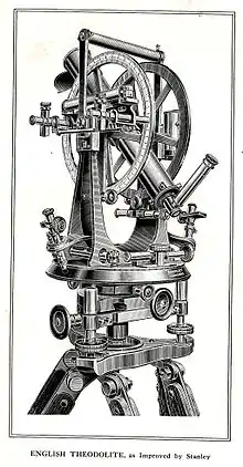 Stanley produced a 'Panoptic Stereoscope' in 1855, which was financially successful.[4] Stereoscopes had sold for five shillings each – Stanley discovered a simpler method to make them, which enable him to sell them for one shilling.[8] He was able to take an additional shops at 3–4 Great Turnstile and 286 High Holborn, as well as a skilled assistant.[3] He did not patent the Panoptic, so it was soon copied around the world, but he had sold enough to provide the capital required to manufacture scientific instruments.[8] In 1861 he invented a straight line dividing machine for which he won first prize in the 1862 International Exhibition in London.[3][10] Stanley brought out the first catalogue of his products in 1864.[8] By the fifth edition, Stanley was able to list important customers such as several government departments, the Army, the Royal Navy, railways at home and abroad, and London University.[11] From 1865, he worked on improving the elegance and stability of surveying instruments, especially the theodolite, whose construction he simplified.[3][4] It had a rotating telescope for measuring horizontal and vertical angles and able to take sights on prominent objects at a distance. The component parts were reduced to fewer than half of the 226 used in the previous version, making it lighter, cheaper and more accurate.[12]