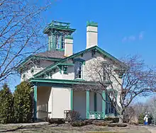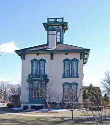The Upton House is a two-story Italianate-style house constructed of brick with a hipped roof and tall cupola.[2] The brick construction indicates the relative affluence of the builder. The exterior is painted and heavy brackets support the eaves. Windows are tall, double-hung, four-over-four lights; the ones on the front facade feature ornate stone hoods while windows on the other sides have brick hoods. A 1+1⁄2-story, gable-roofed addition is located on one side, and a flat-roofed, single-story addition is on another. The cupola, porches, chimneys, and bay window balustrade were reconstructed during the 1981-82 renovation.[2]