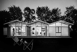 The Kessler House is located on a residential street amid traditional Tudor and Colonial Revival houses, and across the street from Beaumont Hospital.[3] It is a single-story, square plan structure with a light steel frame measuring 39 feet (12 m) by 42 feet (13 m). The most dramatic features of the house are the saw-tooth roof and the textured brick privacy fence that creates an enclosed garden along the front of the house.[3]