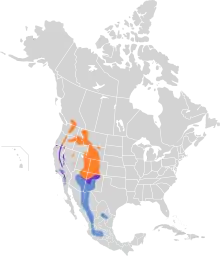 Breeding habitat is open forested areas with conifers, mainly ponderosa pine, douglas-fir, and grand fir. Subalpine fir and western larch may also be important components of good habitat for these birds.[2] Partially migratory, they breed in western North America from northern Mexico as far north as British Columbia. They are permanent residents in some parts of their range; migrating birds form small flocks and may travel as far south as central Mexico.