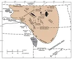 The Upper Cambrian Deadwood Formation was transgressively deposited on the low-relief Precambrian surface. The Deadwood is characterized by shallow marine and coastal plain sediments, with abundant glauconite giving the formation a distinctive green color. The basin started subsiding due to strike-slip movement along northeast–southwest trending faults, resulting in the deposition of the Winnipeg Group, which lies unconformably on the Deadwood. The Winnipeg consists of shallow marine sandstone, shale and shaly carbonate. The Red River Formation lies unconformably on the Winnipeg, and consists of shallow marine carbonate, anhydrite, and salt sedimentation. Conformably overlying the Red River is the Ordovician Stony Mountain Formation and Stonewall Formation, followed by the Silurian Interlake Group. During the Devonian, the Williston Basin became the southeastern corner of the Elk Point Basin when the Elk Point Group, Manitoba Group, and Saskatchewan Group were deposited. The Bakken Formation, an organic-rich marine shale, was deposited in the Late Devonian. The Lodgepole Limestone was deposited during the Mississippian, followed by the Madison Group and the Big Snowy Group. The Tyler Formation was deposited in the Pennsylvanian, and consists of interbedded sandstone, siltstone, shale, and limestone. The overlying Minnelusa Formation is characterized by deposition in alluvial plains, prograding river delta, and barrier island environments. The Minnekahta Formation was deposited during the Permian, followed by the Spearfish Formation and the Nesson Formation. The Pierre Shale was deposited curing the Cretaceous, followed by the Hell Creek Formation, and the Tertiary Fort Union Formation.[17]