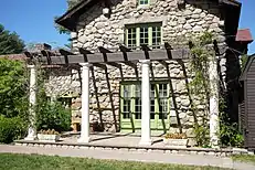 The Willow Dale property expanded throughout Bradley Palmer's lifetime. At the peak of its operation, more than thirty buildings, primarily relating to agriculture or husbandry, but also a garage, a pump house, reservoir, and homes for staff. Records kept by the Topsfield Historical Society state that the addition of these buildings took place intermittently between 1902 and 1915.[7] By 1915, Palmer had come to view his "modest summer home" as a bit too modest. His rapid financial success, shown by tax records stating the amount he paid increased from $15,645 in 1908 to $128,574 in 1923, meant a need for a home that could entertain guests beyond just a few intimate friends. For the job, Palmer again hired Cummings, who added a significant addition to the house's southern wing. The entrance changed from the north wing, directly under Palmer's bedroom, to the western face of the house where it still is today. In the south wing, the stable became a formal dining room, while the coach house became a ballroom, complete with an orchestra balcony, though the exterior of both remained the same. The dining room became an eclectic mix of classical, medieval, and even Central American artwork, while the ballroom resembles a medieval great hall. The interior of the mansion became more elegant with the addition of a number of stained glass windows and the replacement of small, tile fireplaces with ornate, Italian marble ones. Italian artisans were hired to do the design work on the fireplaces as well as the woodwork in the ballroom and new entrance.