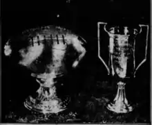 By November 17, 1924, the Defiance Bulldogs led the league with a 7–0 record, second was Shamrock, and third was South Side.[8] A possible deciding game on c. Dec. 1 between Defiance and South Side was called at 12–12 in total darkness. The teams protested the game and the arbitration board (George N. Boggs, Ben Greenstein (former president), and Joseph D. M'Laughlin) declared that the game would not count, due to errors in the officiating.[9] By week 12 the Defiance Bulldogs (10–1) and South Side-Eden Snappers (10–2) were tied for 1st due to the standings running on points rather than win-loss percentage.[10] A protest-play-off game was scheduled for January 3 between Defiance and South Side.[11][12] The game was postponed due to the field being covered in snow.[13] A meeting was held between the league officials a few days later.[14] The Snappers won a game against Defiance on c. March 29 in front of 1,200 fans, making another game necessary to decide the league champions.[15] Eventually the Shamrock A.C. were in position to play in the league championship and won against Defiance, 25 to 6.[16] The Shamrock A.C. were awarded two championship trophies, one provided by Bottomley and Company, and the other by Norman I. Harris Jewelers.[17]