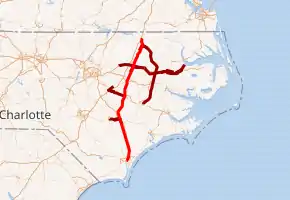 ![]() Original route of the Wilmington and Weldon Railroad main line (red) and branches (dark red). Click to enlarge. | |