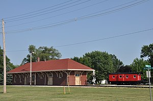 Chicago, Rock Island and Pacific Railroad-Wilton Depot is an historic building located in Wilton, Iowa, United States. The Mississippi and Missouri Railroad built the first rail line in 1855 in what would be called Wilton Junction.[2] The railroad became the Chicago, Rock Island and Pacific Railroad (CRI&P) a few years later. A wooden frame depot and a separate freight facility served the community. The railroad placed their repair and maintenance center in Wilton, and it remained here until 1881 when they started to move operations to Davenport and Muscatine. Rail service continued to increase along the CRI&P, which necessitated a new depot in Wilton.[3] This single-story, brick Romanesque Revival structure was completed in 1898. Six passenger trains stopped in Wilton in 1911, and by 1922 same-day service to and from Chicago began. While the number of freight trains passing through town numbered five or six by 1947, the number of passenger trains declined to one in 1948. The depot received part-time service from 1963 to 1974, when the depot closed.