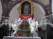 Kadłubek died on 8 March 1223 and his remains were buried before the high altar of the convent church. His remains were exhumed on 26 April 1633 with his pallium found intact though his remains had become skeletal. Measurements were taken and it was surmised that he was of "fair height".[1] His remains were moved to a new location before the high altar on the following 16 August. Kadłubek's remains were again exhumed and reinterred in mid-1765 and some were moved to Sandomierz in 1845 for veneration. Other parts to his remains were moved in 1903 to Wawel and placed in a silver urn.[2][3]