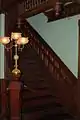Before the 1906 earthquake, the house had been seven stories high and carpenters may have been brought in initially to repair damage caused by the quake.[10] Today it is only four stories. The house is predominantly made of redwood, as Mrs. Winchester preferred the wood; however, she disliked the look of it. She, therefore, demanded that a faux grain and stain be applied. This is why almost all the wood in the home is covered. Approximately 20,500 U.S. gallons (78,000 L) of paint were required to paint the house. The home itself is built using a floating foundation that is believed to have saved it from total collapse in the 1906 earthquake and the 1989 Loma Prieta earthquake. This type of construction allows the home to shift freely, as it is not completely attached to its brick base. There are roughly 161 rooms, including 40 bedrooms, two ballrooms (one completed and one unfinished) as well as 47 fireplaces, over 10,000 panes of glass, 17 chimneys (with evidence of two others), two basement levels and three elevators. Winchester's property was about 162 acres (66 ha) at one time, but the estate has since been reduced to 4.5 acres (1.8 ha) – the minimum necessary to contain the house and nearby outbuildings. It has gold and silver chandeliers, hand-inlaid parquet floors and trim, and a vast array of colors and materials. Due to Mrs. Winchester's debilitating arthritis, special "easy riser" stairways were installed as a replacement for her original steep construction. This allowed her to move about her home freely as she was only able to raise each foot a few inches. There was only one working toilet for Winchester; it has been said that "all other restrooms were decoys to confuse spirits" and that this is also "the reason why she slept in a different room each night".[12] The home's conveniences were rare at the time of its construction. These included steam and forced-air heating, modern indoor toilets and plumbing, push-button gas lights, and Mrs. Winchester's personal (and only) hot shower from indoor plumbing. There are also three elevators, including an Otis electric and one of which was powered by a rare horizontal hydraulic elevator piston. Most elevator pistons are vertical to save space, but Winchester preferred the improved functionality of the horizontal configuration.