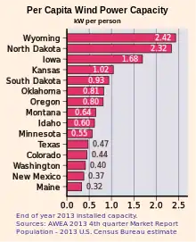 Wyoming has one of the highest wind power potentials of any state in the United States. As of 2016, Wyoming has 1,489 megawatts (MW) of wind powered electricity generating capacity, responsible for 9.42% of in-state electricity production.[1] Wyoming produced of 3,800 GWh in 2015,[2] about 9% of the total.[3]