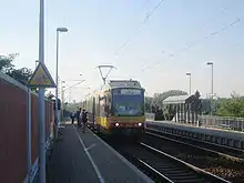 Wörth Mozartstraße is a "halt" (Haltepunkt) located near the centre of Wörth am Rhein, which went into operation in March 2009. Originally it was planned to erect a station for Regionalbahn services at the end of the town centre, which is located on the north-western outskirts of the city, in order to allow a change between Stadtbahn and Regionalbahn services. However, the town of Wörth favoured a more central station, which was eventually built.