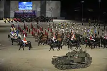 - ...a celebration of the capabilities of today’s forces through music and action. It is a tri-service event and has a packed programme of international and British military acts, massed bands, pipes and drums, modern military re-enactments and a fantastic finale.....The Tattoo tells the story of modern life in each of the services (the Army, the Royal Air Force and the Royal Navy) and large screens show footage from each of the services in action in war zones, taking the audience to the current operational environment.[3]