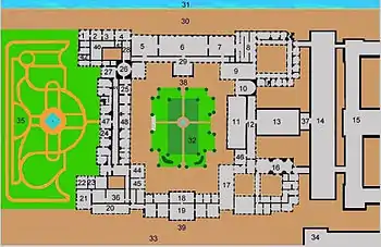 Guests on ceremonial and state occasions would follow a set processional route, arriving at the palace courtyard through the central arch of the south façade, and then entering the palace through the state entrance (sometimes called the ambassadors' entrance) (38). They would then proceed through the colonnaded Jordan Hall before mounting the gilded Imperial staircase (8), from where the two enfilades of state rooms spread out. The principal or Jordan Staircase, so-called because on the Feast of the Epiphany, the Tsar descended in state for the ceremony of the Blessing of the Waters, is one of the few parts of the palace to retain the original 18th century rococo style, although the massive grey granite columns were added in the mid-19th century.[17]